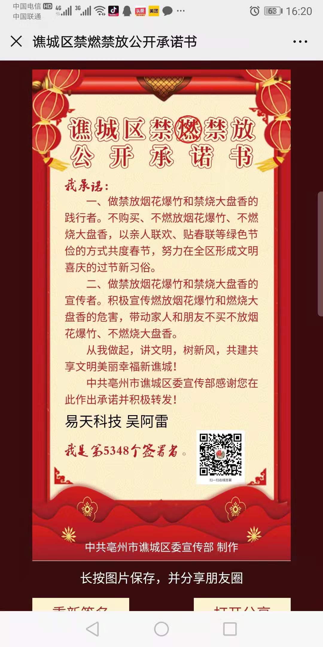 譙城區(qū)禁燃禁放公開承諾書我承諾:一、做禁放煙花爆竹和禁燒大盤香的踐行者。不購買、不燃放煙花爆竹、不燃燒大盤香,以親人聯(lián)歡、貼春聯(lián)等綠色節(jié)儉的方式共度春節(jié),努力在全區(qū)形成文明喜慶的過節(jié)新習(xí)俗。二、做禁放煙花爆竹和禁燒大盤香的宣傳者。積極宣傳燃放煙花爆竹和燃燒大盤香的危害,帶動家人和朋友不買不放煙花爆竹、不燃燒大盤香。從我做起,講文明,樹新風(fēng),共建共享文明美麗幸福新譙城!譙城區(qū)委宣傳部感謝您在此作出承諾并積極轉(zhuǎn)發(fā)??