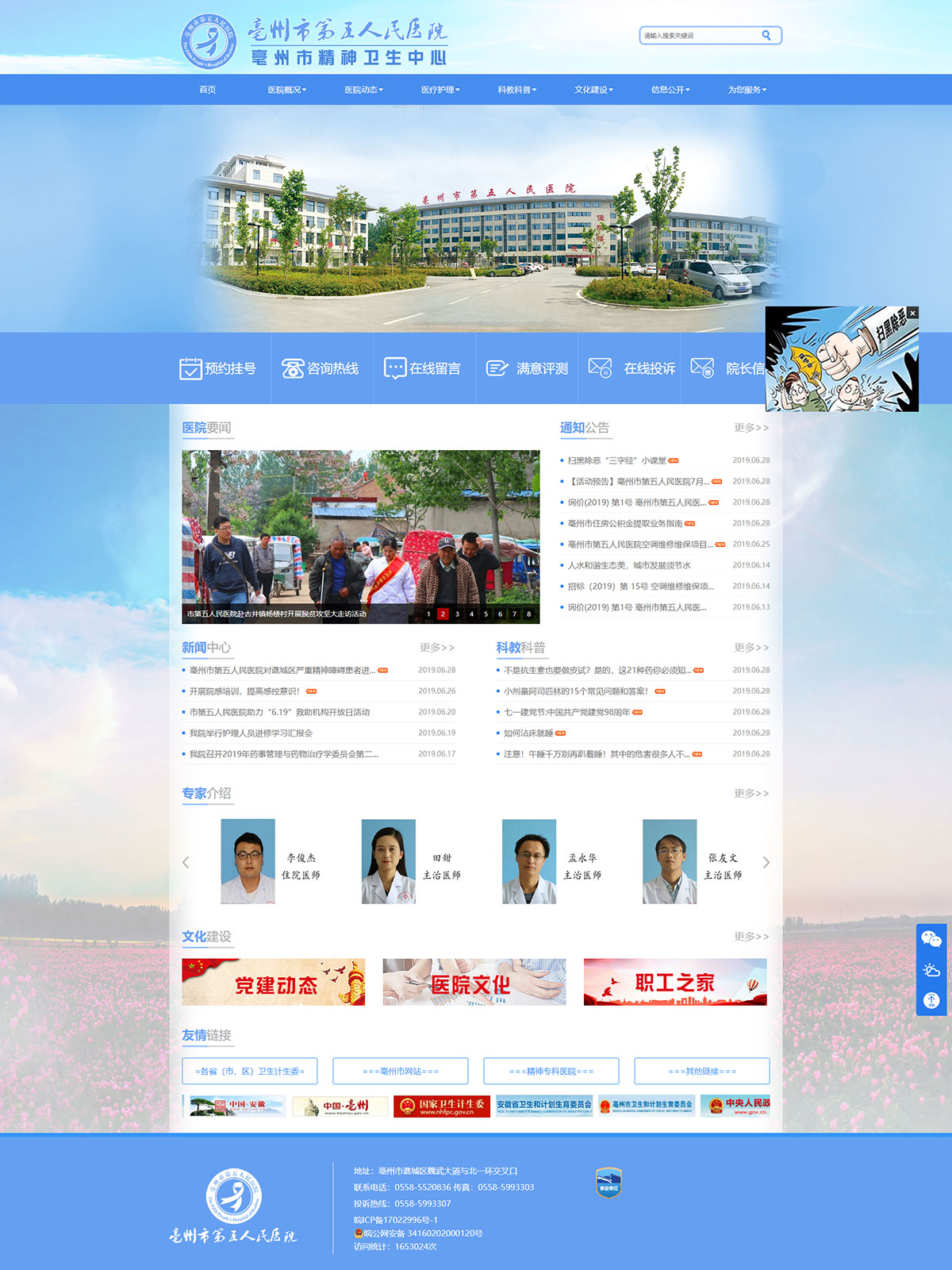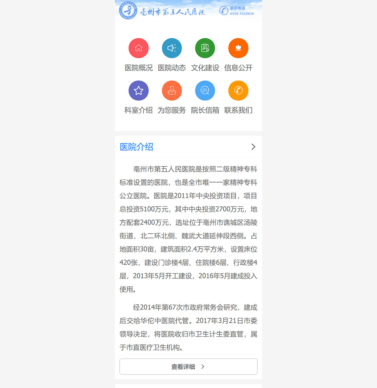 亳州市第五人民醫(yī)院是按照二級(jí)精神??茦?biāo)準(zhǔn)設(shè)置的醫(yī)院,也是全市唯一一家精神專科公立醫(yī)院。醫(yī)院是2011年中央投資項(xiàng)目,項(xiàng)目總投資5100萬元,其中中央投資2700萬元,地方配套2400萬元,選址位于亳州市譙城區(qū)湯陵街道,北一環(huán)北側(cè)、魏武大道延伸段西側(cè)。占地面積30畝,建筑面積2.4萬平方米,設(shè)置床位420張,建設(shè)門診樓4層、住院樓6層、行政樓4層,2013年5月開工建設(shè),2016年5月建成投入使用。